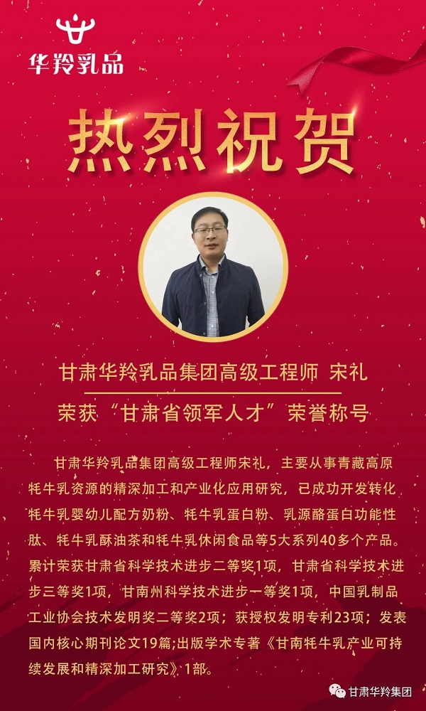 近日,甘肅省委、省政府聯合公布了補充調整甘肅省領軍人才的決定文件,甘肅華羚乳品集團高級工程師宋禮榜上有名,被列為“甘肅省領軍人才”。