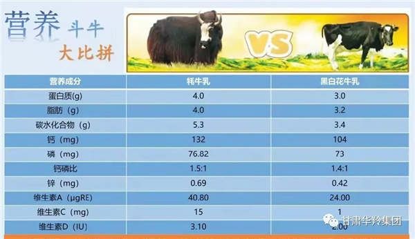 牦牛奶的氨基酸、鈣、維生素A含量分別比普通牛奶高15%、15%和6%。微量元素中,牦牛奶中所含的鐵是一般牛奶的9.8倍、鋅含量是一般牛奶的3倍、鈣含量是一般牛奶的1.13倍。牦牛奶中含有的免疫球蛋白是普通牛奶所缺少的,長期飲用會有助于提高人體免疫力,牦牛奶也因此被譽為"奶中極品"。