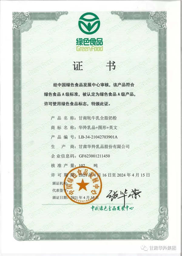 喜訊!華羚乳品甘南牦牛乳全脂奶粉榮獲“綠色食品”認證證書